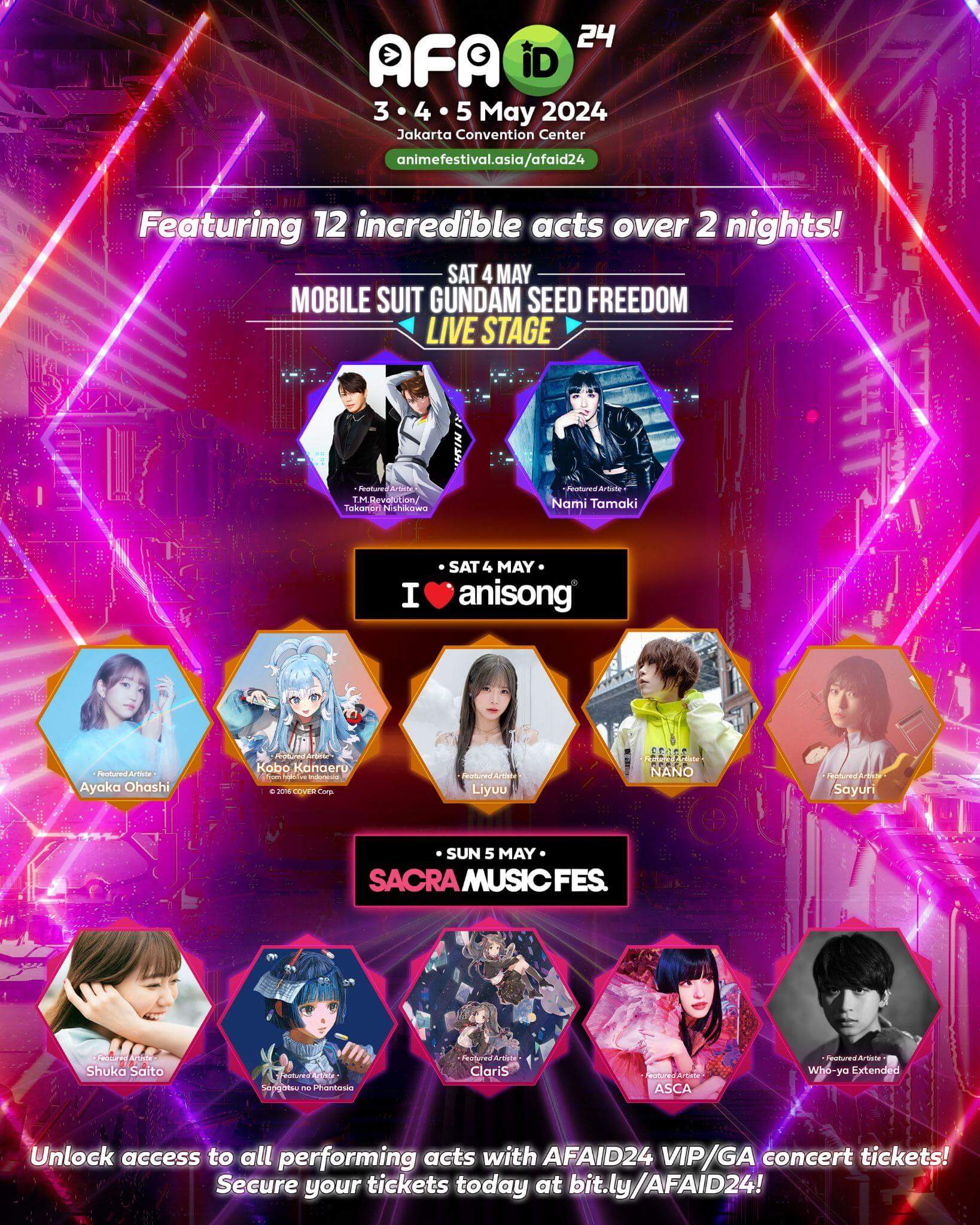 Anime Festival Asia Indonesia 2024 dengan bangga sebagai salah satu acara musik live terbesar bagi para penggemar ACG di Indonesia dan kawasan Asia Tenggara! Para penggemar sudah menyaksikan lebih dekat, tidak hanya satu tetapi tiga panggung, dengan line-up yang luar biasa dengan musisi 12 artis internasional!