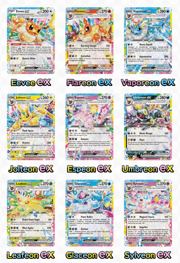 “Delapan evolusi Eevee selalu mendapat perhatian dari para penggemar Pokémon karena bentuknya yang menawan dan juga memiliki kekuatan di atas rata-rata. Dalam Pokémon Game Kartu Koleksi seri Festival Terastal ex, ilustrasi Flareon, Vaporeon, Jolteon, Espeon, Umbreon, Leafeon, Glaceon, dan Sylveon dihadirkan dalam rupa terastal atau kristalisasinya, dengan kemunculan kartu Umbreon ex Special Art Rare (SAR) sebagai incaran utama,” ujar Fachrul Amrullah, Head of Marketing at AKG Entertainment.