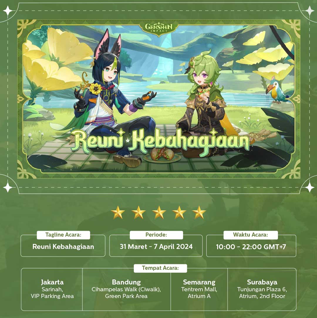 Rangkaian acara Genshin Impact akan diadakan dari tanggal 31 Maret hingga 7 April 2024, dari pukul 10.00 – 22.00 WIB di empat lokasi berikut di Indonesia: