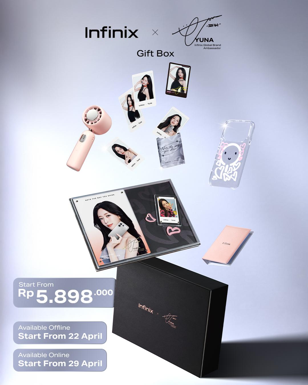 NOTE 60 Pro Exclusive Yuna Gift Box dapat diperoleh mulai 22 April melalui Infinix Official Offline Store, serta mulai 29 April melalui Infinix Official Online Store.