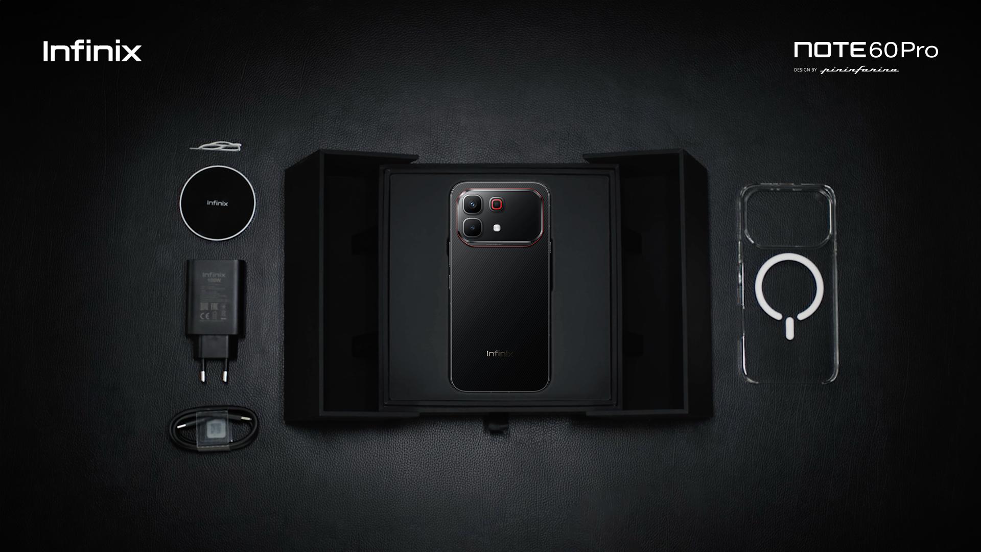 NOTE 60 Ultra juga hadir dalam kemasan Ultra Exclusive Box, yang melengkapi pengalaman premium sejak pertama kali dibuka. Dalam paket ini, pengguna tidak hanya mendapatkan perangkat, tetapi juga berbagai aksesoris pendukung seperti charger, charging cable, phone case, customized SIM ejector pin, wireless charging pad, serta car-shaped wireless charging stand base.