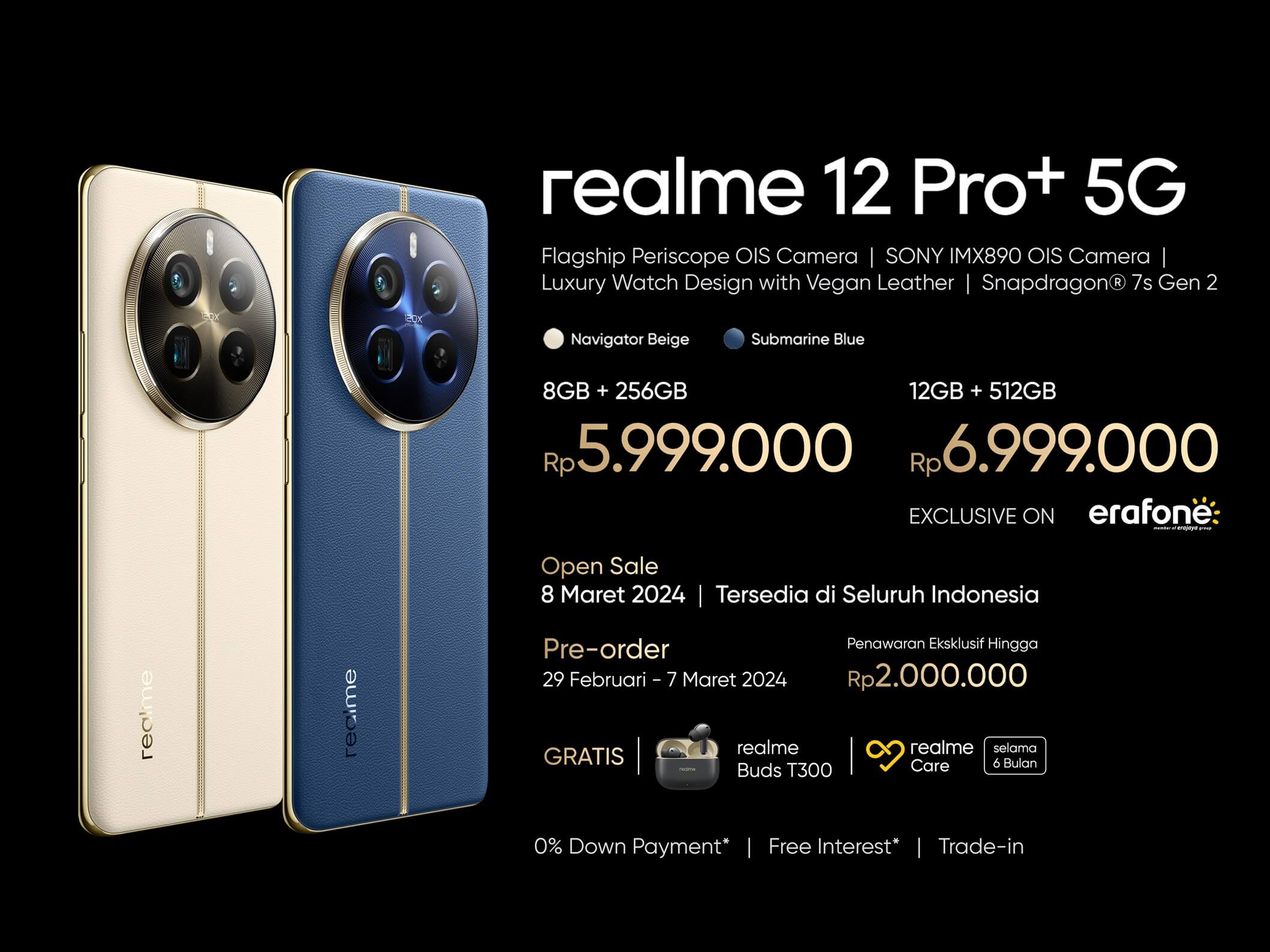 realme 12 Pro+ 5G varian memori 12GB+12GB*|512GB dijual eksklusif hanya di Erafone mulai tanggal 8 Maret 2024.