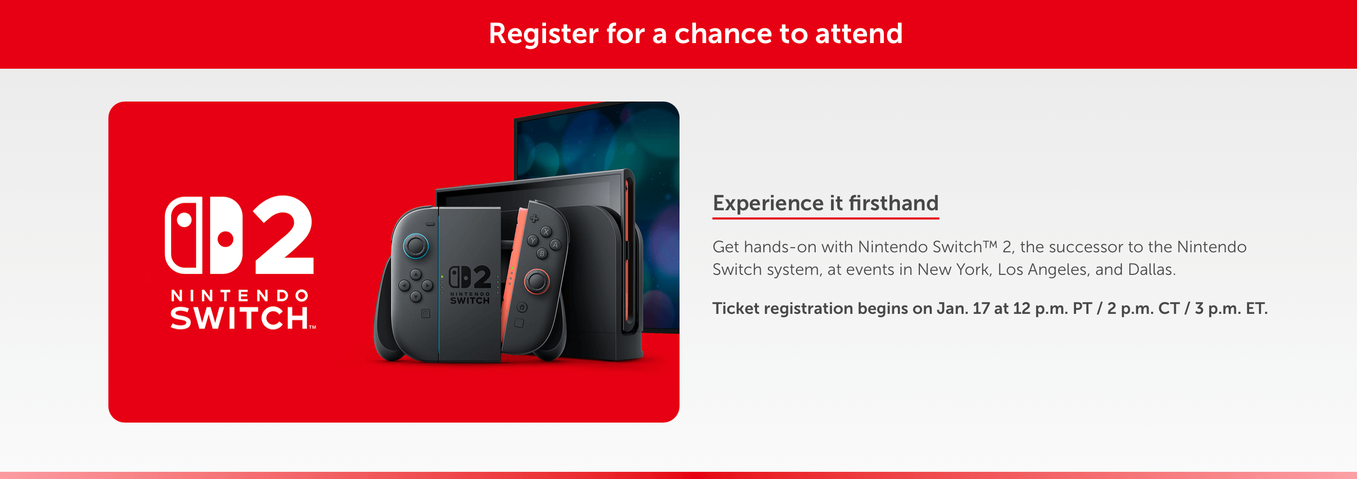 Secara spesifikasi lengkapnya, Nintendo belum banyak memberitahukan dan sepertinya para fans masih harus menunggu hingga Nintendo Direct yang akan dibawakan oleh Nintendo pada tanggal 2 April 2025 mendatang. Selain itu Nintendo juga mengumumkan bahwa akan ada World Tour untuk para fans dapat mencoba Nintendo Switch 2 pertama kalinya beberapa hari setelahnya.