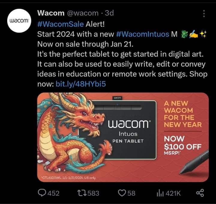 wirepop.id – Wacom, perusahaan yang terkenal sebagai produknya pen tablet yang dicintai para artist dan ilustrator, melakukan blunder. Pada iklan terbarunya untuk promosi Chinese New Year, Wacom menggunakan gambar naga hasil dari produksi generative AI. Hal ini memicu perdebatan karena para ilustrator merasa dikhianati oleh merk yang sudah mereka percaya menjadi peralatan tempur mereka.