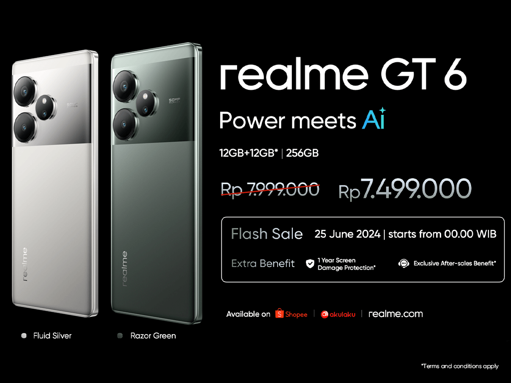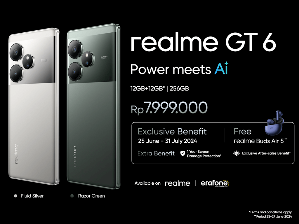 realme GT 6 Flagship Killer hadir di Indonesia dengan varian memori 12GB+12GB*|256GB serta dua pilihan warna Fluid Silver dan Razor Green yang bisa didapatkan dengan harga khusus online Flash Sale Rp7.499.000 (potongan Rp500.000) pada 25 Juni 2024 eksklusif di Shopee, Akulaku, dan realme.com. Pada pembelian di saluran offline seperti realme Brand Store dan toko mitra, pelanggan dapat memperoleh gratis realme Buds Air 5 untuk pembelian 25 – 27 Juni serta berbagai fasilitas pembayaran senilai hingga Rp3.500.000, pada periode 25 Juni – 31 Juli 2024.