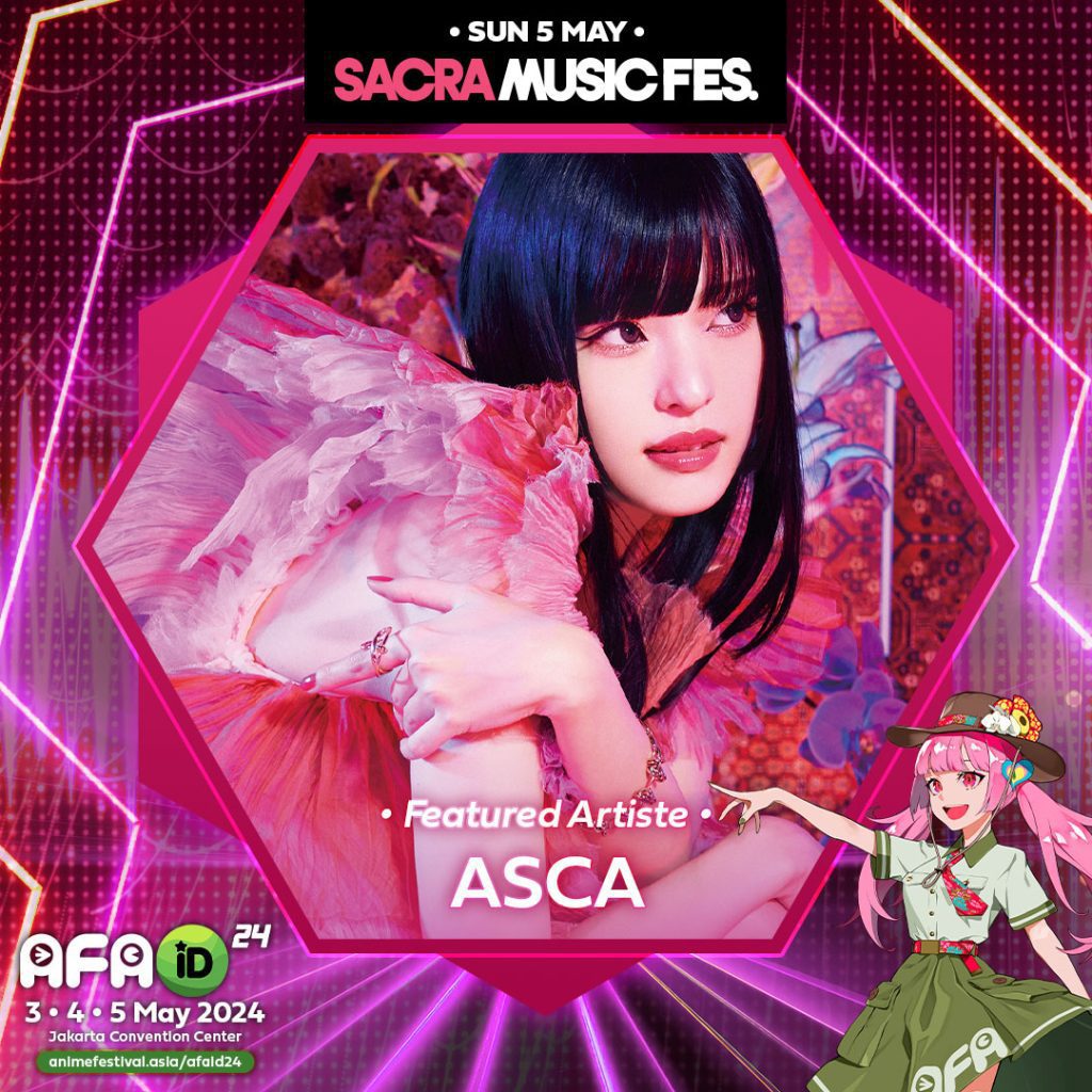 ASCA sudah menjadi pengisi lagu berbagai macam anime, salah satu yang sangat berkesan adalah Sakuraso no Pet no Kanojo, anime lawas yang populer pada eranya. Tapi ga cuman itu, ia juga mengisi di serial Anime yang masih sangat digemari Sword Art Online Alicization! Sebelumnya kita sudah sempat melihat kehdirannya di AFASG23 lalu, dan sangat menantikan performance-nya di Indonesia.